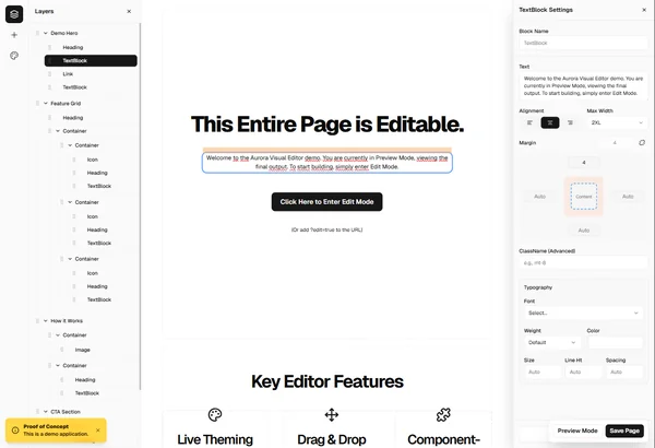 - Content Editing: Inline, live editing for text-based blocks like `Heading` and `TextBlock` is fully functional.