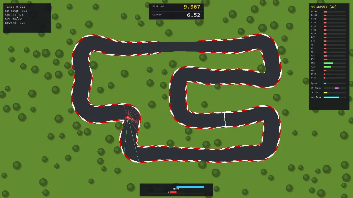 - Input Optimization: Improved lap times by ~10% by augmenting LIDAR-style raycasts with "GPS" features (Next Checkpoint Angle, Distance, and Lap Progress).