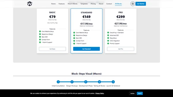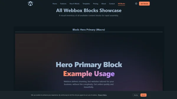 The vision for Webbox is to create a robust, reusable template that accelerates the development of bespoke websites for clients. It follows a block-based architecture where developers can rapidly assemble complex pages by combining a rich library of pre-built, customizable "Blocks." This approach streamlines the creation of common web patterns, while the integrated DaisyUI theming system allows for quick and easy branding adjustments.