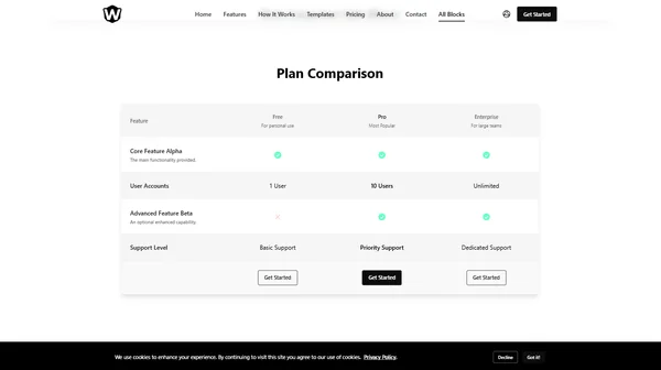 - Interactive UI Elements: Several components are enhanced with Alpine.js, including a functional FAQ accordion, a cookie consent banner, and an image gallery with a lightbox.